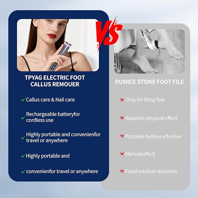 - 2025 NEW 2-in-1 Electric foot Callus Remover Multifunctional Design:This electric callus remover efficiently removes dead skin, hard calluses, and rough edges while also working as a nail buffer and foot smoother. With interchangeable roller heads, itβs perfect for both pedicures and manicures, making it an essential personal care tool.
