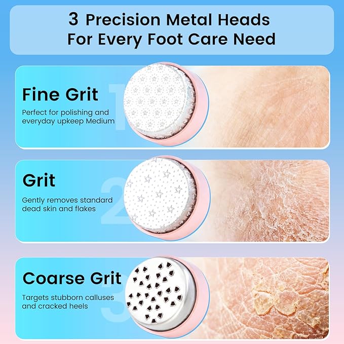 - 3 Replaceable Grinding Heads: The electric foot file features three grinding heads: rough for stubborn calluses, medium for dead skin and flakes, and fine for daily foot care. Safe and effective after a bath, it restores smooth, soft skin for beautifully cared-for feet