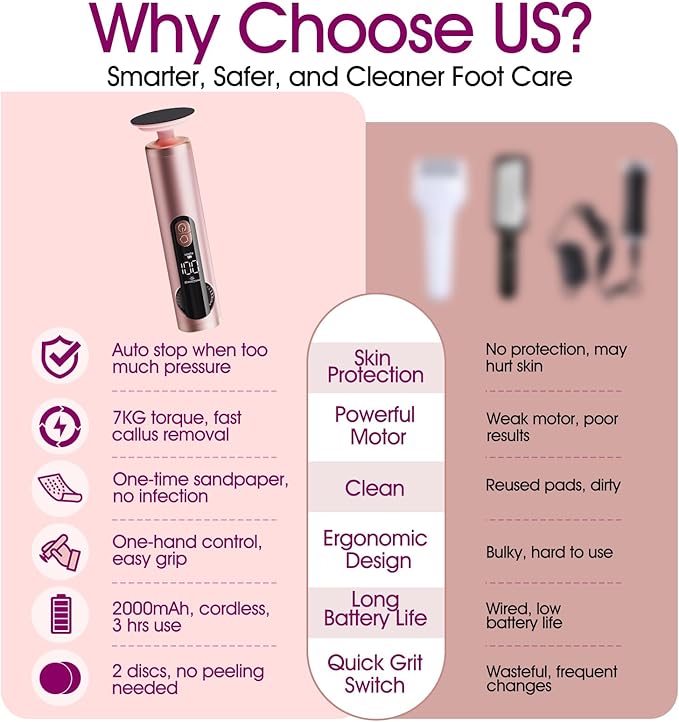 - 【Dual Replaceable Discs & Multiple Grit Options】 Comes with 2 detachable discs for easy swapping—no more hassle of constantly peeling and sticking sandpaper as with older tools. Includes 20 coarse and 20 fine sanding papers for different callus conditions, plus 10 nail buffer sanding rings to polish nails. Compared with basic manual files that take extra effort, this all-in-one electric foot file makes the process faster, cleaner, and far more convenient, whether for family or multi-location use.