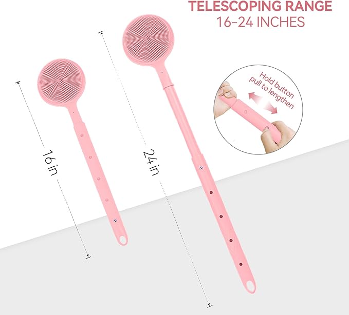 Back Scrubber for Shower, (16-24 Inch) Extendable Bath Brush Long Handle for Shower, Silicone Body Scrubber with Handle, Back Brush for Shower Men and Women,Easy to Clean (Pink)