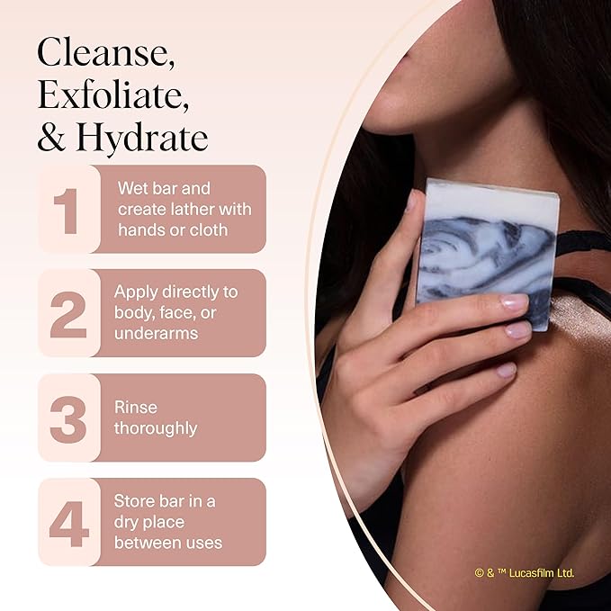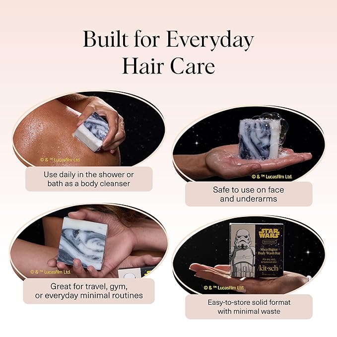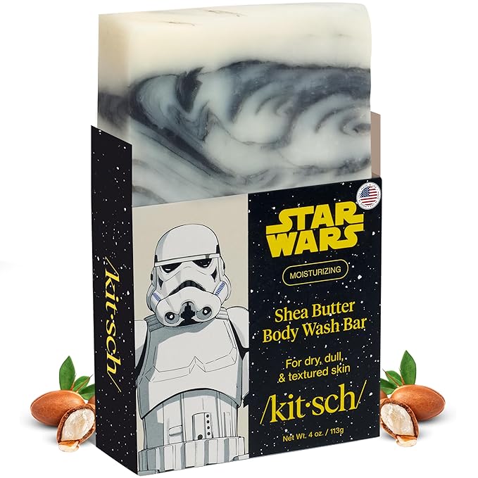 - STAR WARS X KITSCH SHEA BUTTER EXFOLIATING BODY WASH BAR – STORMTROOPER SWIRL – Part of the exclusive Star Wars x Kitsch collection, this moisturizing exfoliating soap combines shea butter’s vitamins and fatty acids with eco-friendly, vegan ingredients. Proudly made in the USA and free of sulfates, parabens, phthalates, and artificial fragrance. Convenient for home or as a travel body wash.