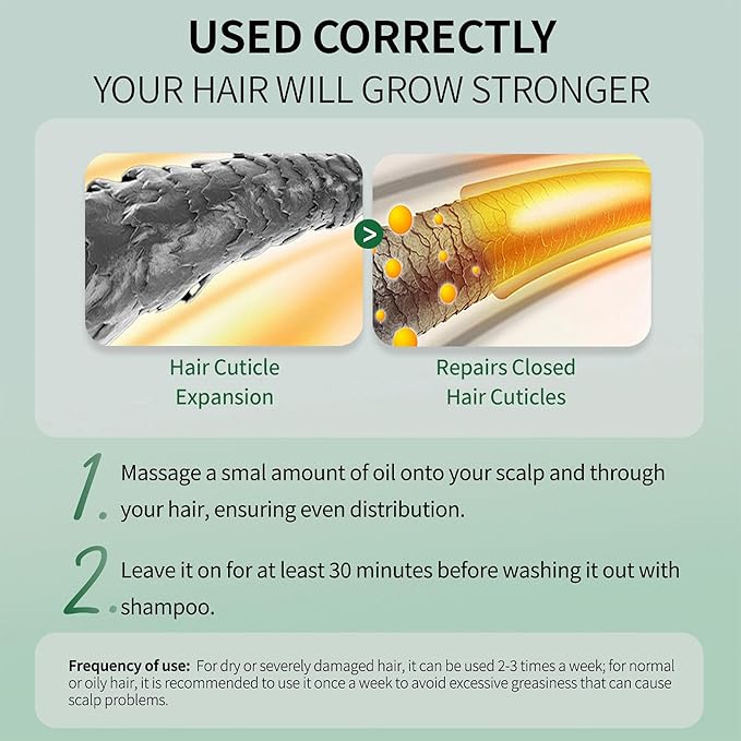 - 【Simple Application】Apply an appropriate amount of hair growth oil to your scalp and massage for 3-5 minutes. Then, put on a shower cap and leave it on for 20-30 minutes. Finally, rinse thoroughly with warm water. Incorporate this into your regular hair care routine for optimal nourishment, hydration, and strengthening of hair strands, while also preventing damage.