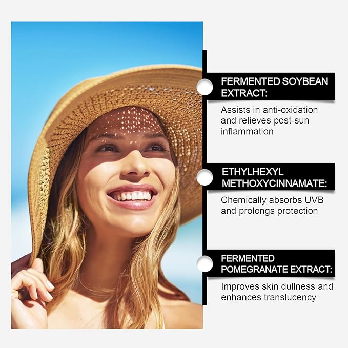 - 【Natural Formula with Fermented Extracts】Infused with fermented soybean, pomegranate, and barley extracts, this Korean sun screen combines natural potency with skin-friendly care. Designed as a gentle sunscreen for face skincare, it soothes and protects even sensitive skin types.