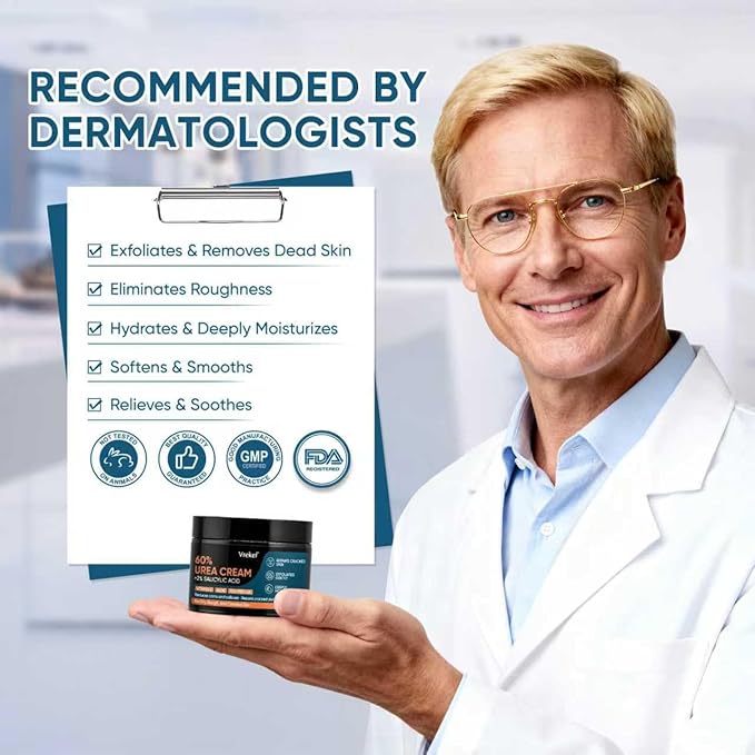 - Foot Care Solution: VREKEF Urea Cream 60% with 2% Salicylic Acid deeply penetrates to hydrate and soften cracked feet, gently exfoliating rough patches. Ideal for foot care, this powerful duo of urea and salicylic acid soothes discomfort from calluses, restoring smooth, refreshed heels even after prolonged activity or ill-fitting shoes.