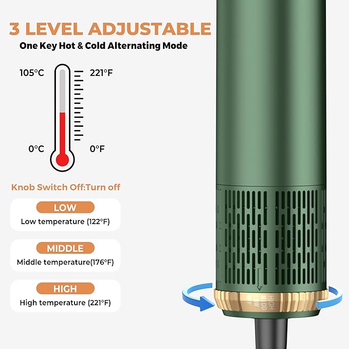 - ⏰ Hair Dryer Drush Blow Dryer For All Hair - Blowdryers brush for hair supplies 3 temperature settings to adjust the heat. Magic styler is suitable for different hair types. High: quickly shape for thick & pre-dried hair. Middle: Suitable for long-lasting hairstyles you set. Low: Suitable for fine, soft, damaged & treated hair. The Hair brush blow dryer can effectively dry hair without damaging the hair, and it is flexible to set various hairstyles you want.