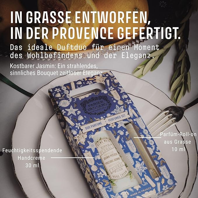 Panier des Sens - Jasmine Gift Duo - Hydrating Hand Cream with 96% Natural Ingredients & Roll-On Eau de Toilette - Made in France, Vegan, Perfect Holiday Gift - Travel Size 1.7 Fl Oz + 0.3 Fl Oz
