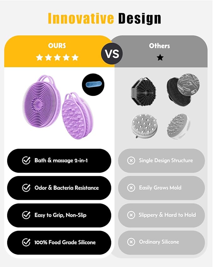 - FACE & BODY SCRUBBER - Made with hypoallergenic, BPA-free silicone, this tool also serves as a silicone face scrubber, safe for sensitive skin and daily facial cleansing. Whether you're scrubbing your back, legs, or gently exfoliating your cheeks, it offers the versatility of multiple scrubbies for the body in one compact solution