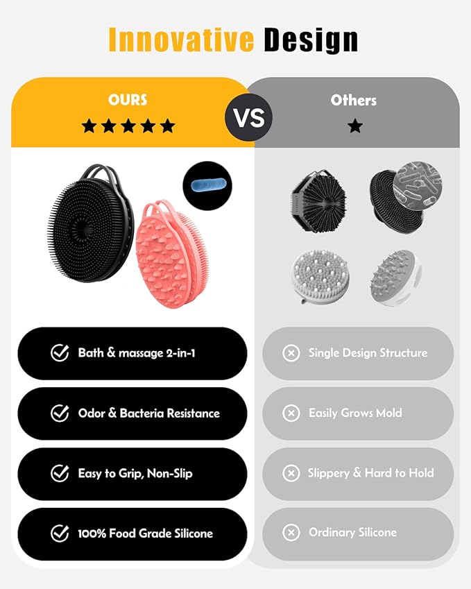 - FACE & BODY SCRUBBER - Made with hypoallergenic, BPA-free silicone, this tool also serves as a silicone face scrubber, safe for sensitive skin and daily facial cleansing. Whether you're scrubbing your back, legs, or gently exfoliating your cheeks, it offers the versatility of multiple scrubbies for the body in one compact solution