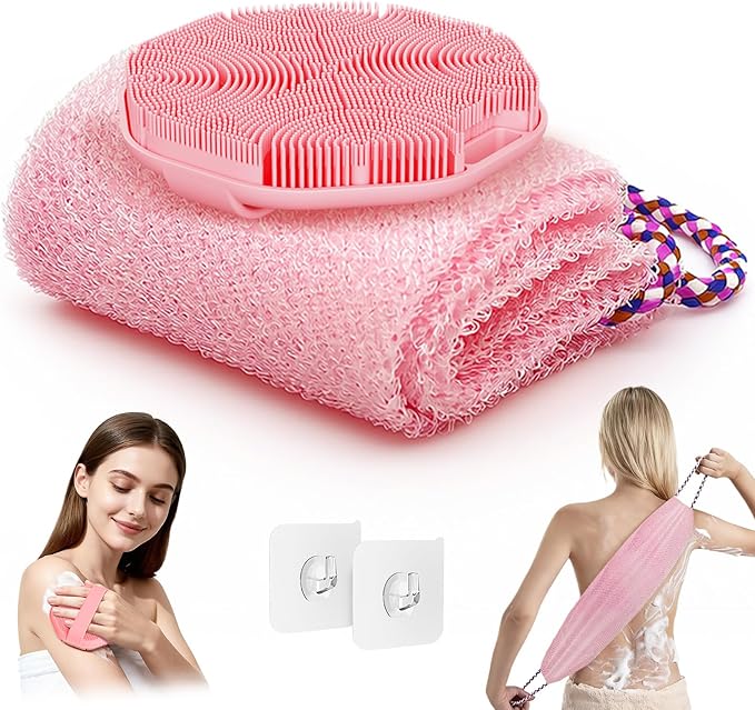 Manmihealth Soft Silicone Body Scruuber & African Bath Sponge Net Set, Gentle-Cleansing Shower Brush & Exfoliating Mesh Combination, Lathering Well Africa Wash Net Shower Scrubber (Pink)