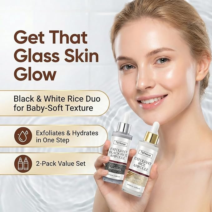 - Black & white rice peeling ampoule gently dissolves dead skin cells without irritation – reveals baby-soft texture on face AND body. No harsh scrubs needed!