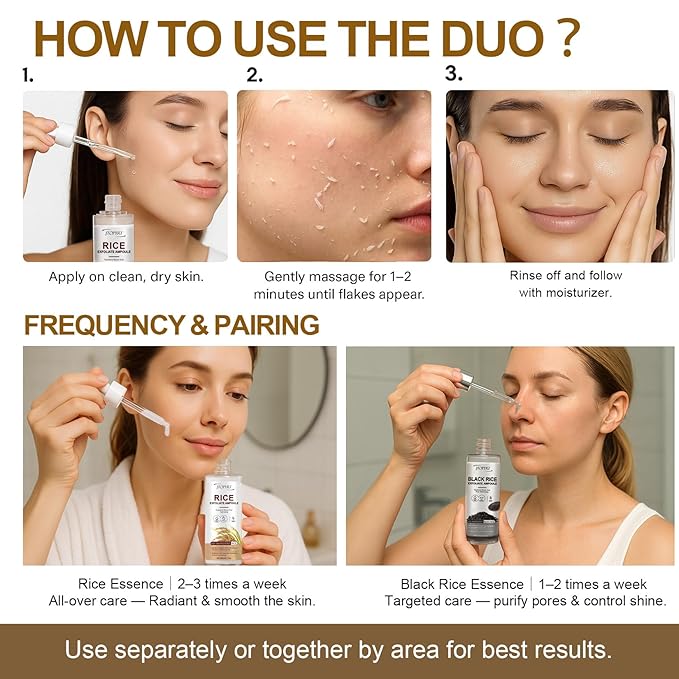 - 【Your 2-Step Solution for Dullness and Rough Texture】For anyone battling uneven tone and rough skin, this complete 2-bottle set (2.7 Fl Oz each) is your answer. Used consistently morning and night, White Rice helps revive skin radiance while Black Rice refines pores, working together to reveal a more balanced, refined, and healthy-looking complexion.