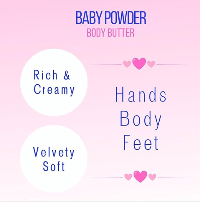- Deeply Nourishing: Crafted for all skin types, this baby powder scented body butter delivers a cocoon of moisture and care. Shea butter soothes and softens, while coconut oil melts into the skin for weightless hydration. Combined with protective coconut butter, the blend comforts dry areas, restoring balance and leaving you delicately perfumed with the nostalgic, gentle scent of baby powder.