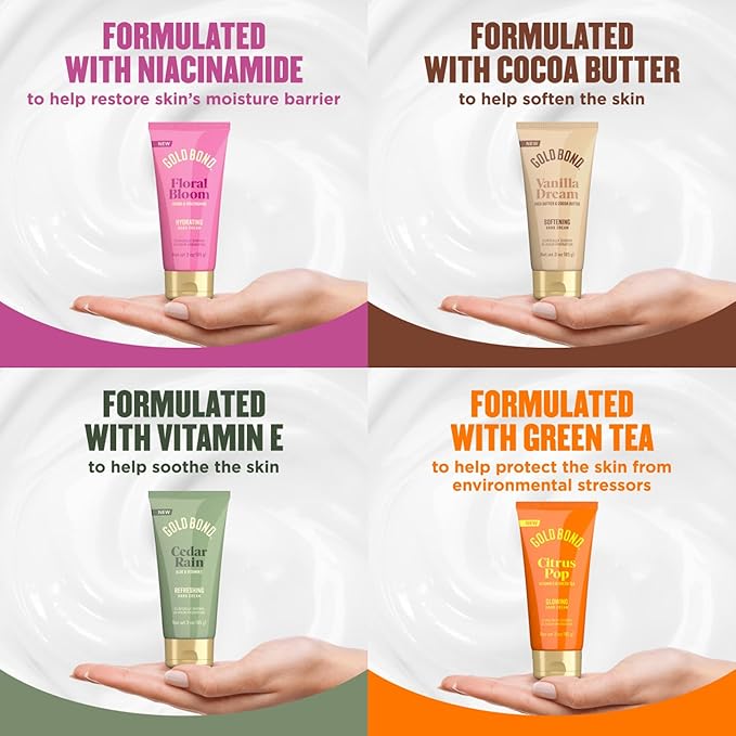 - INCLUDES: Four (4) 3 oz. bottles of Gold Bond Scented Hand Creams; One of each scent: Floral Bloom, Cedar Rain, Citrus Pop, & Vanilla Dream