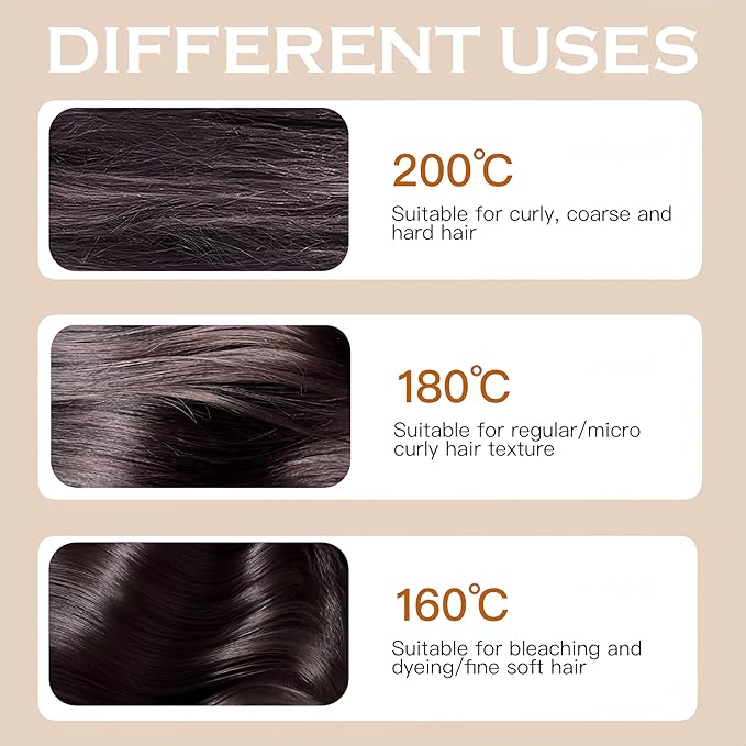 - 【Adjustable Temperature Settings】Choose from three temperature settings (160°C, 180°C, and 200°C) to match your hair type. Whether fine or thick, fragile or coarse, you can style your hair confidently while minimizing heat damage.