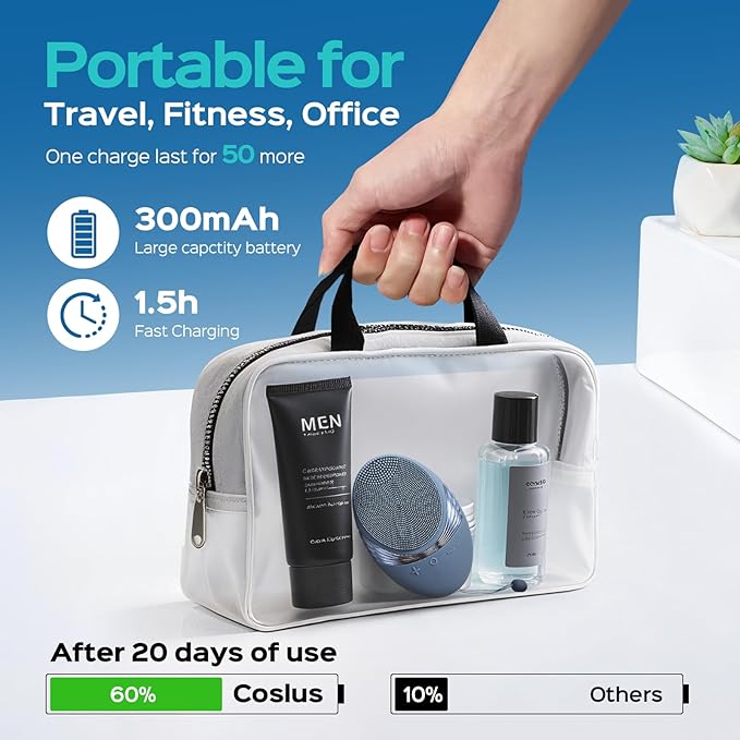 - 50 DAYS ULTRA-LONG BATTERY LIFE, USE ANYTIME ANYWHERE: The COSLUS portable silicone face scrubber uses a powerful battery, with a battery life twice that of other products on the market. With just 1.5 hours of charging, it can be used for 50 days. Its compact and lightweight design makes it perfect for use at home or on the go, and it comes with a USB cable (adapter not included) for charging. With a super long 50-day battery life, it is truly a portable solution for your convenience while travel