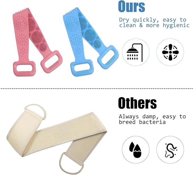 - 【Exfoliating Back Scrubber】The blue&pink shower brush is made of silicone material, which is soft. It can help you gently exfoliate and massage your skin.