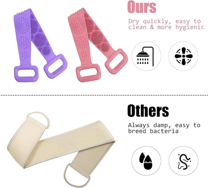 - 【Exfoliating Back Scrubber】The pink&purple shower brush is made of silicone material, which is soft. It can help you gently exfoliate and massage your skin.