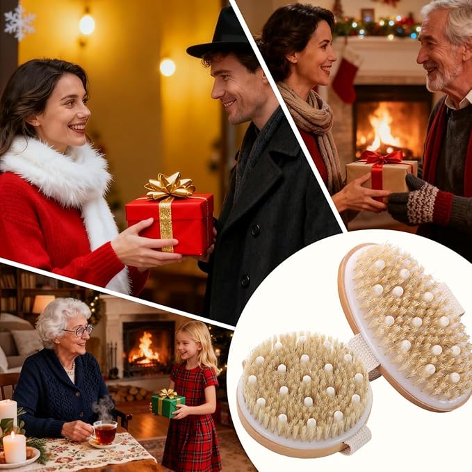 - [Vegan Dry Brush]: Good for sensitive skin! The bristles are 100% vegan and cruelty free. It's perfect, not too rough or soft. It's a medium abrasiveness. The curve in the handle makes it easier to reach your back. Anti-slip design is help you to grab the handle in the bathroom, when your hands are wet. Plush our bonus hanger sticker, you can use the loop at the end to hang around for easy drying.