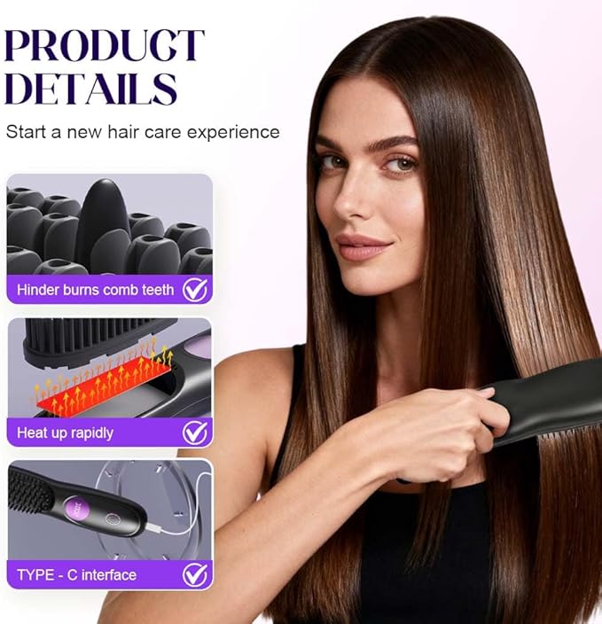 - Rapid 2-Minute Heat-Up: This portable hair straightening brush heats evenly in just 2 minutes, minimizing waiting time. Achieve smooth, frizz-free, shiny hair fast while protecting it from heat damage—ideal for quick styling on busy mornings.