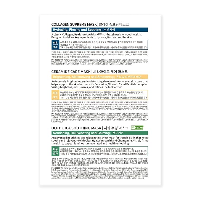 - CLINICALLY PROVEN TO WORK - All #OOTD products are clinically tested to prove its efficacy. COLLAGEN SUPREME MASK confirmed to hydrate, increase skin elasticity and optimize pH value of the skin. CERAMIDE CARE MASK to hydrate, increase skin elasticity, brighten the skin and optimize its pH value. CICA SOOTHING MASK confirmed to hydrate and increase skin elasticity.