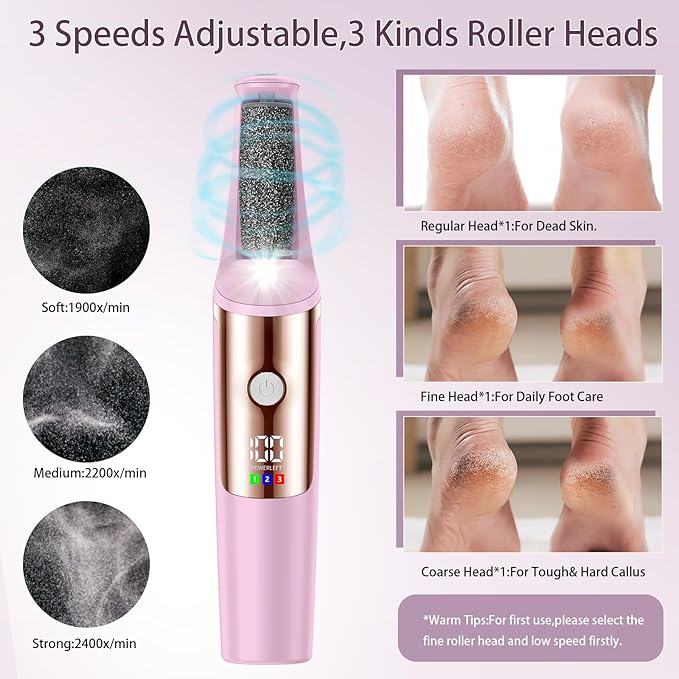 - 【3Speeds and 3 Rollers】By touching the power button, you can switch between three scientific speeds:low speed 1900x/min,medium speed 2200x/min,high speed 2400x/min. Three rollers that are ready to use after a shower, with varying degrees of coarseness for different types of calluses, hard, cracked and dead skin. Unlike other manual devices, these rollers won't hurt you.