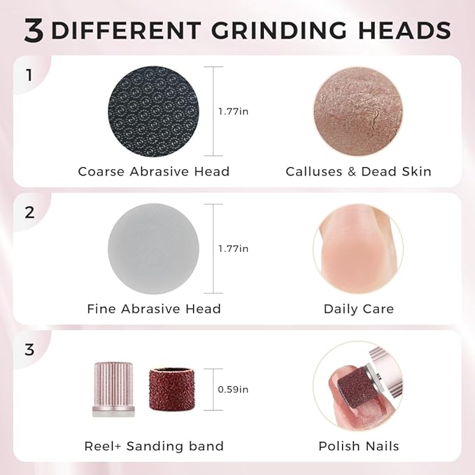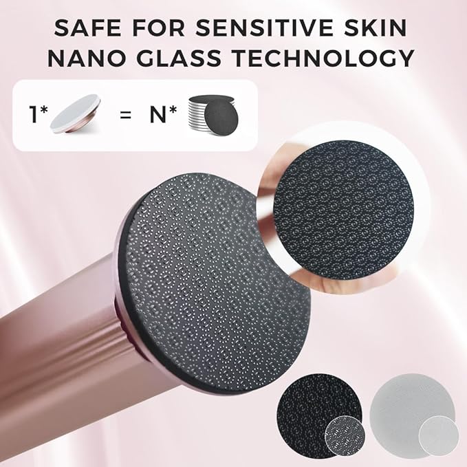- Nano Glass Heads – Gentle & Effective: Includes 3 interchangeable heads: a coarse head for tough calluses, a fine head for daily care. Nano glass gently removes dead skin without harming healthy skin.