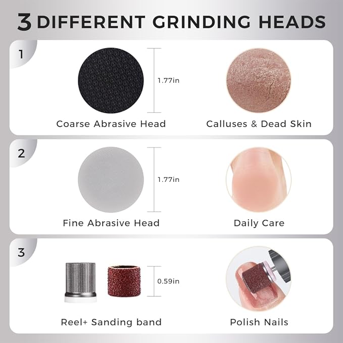 - Nano Glass Heads – Gentle & Effective: Includes 3 interchangeable heads: a coarse head for tough calluses, a fine head for daily care. Nano glass gently removes dead skin without harming healthy skin.